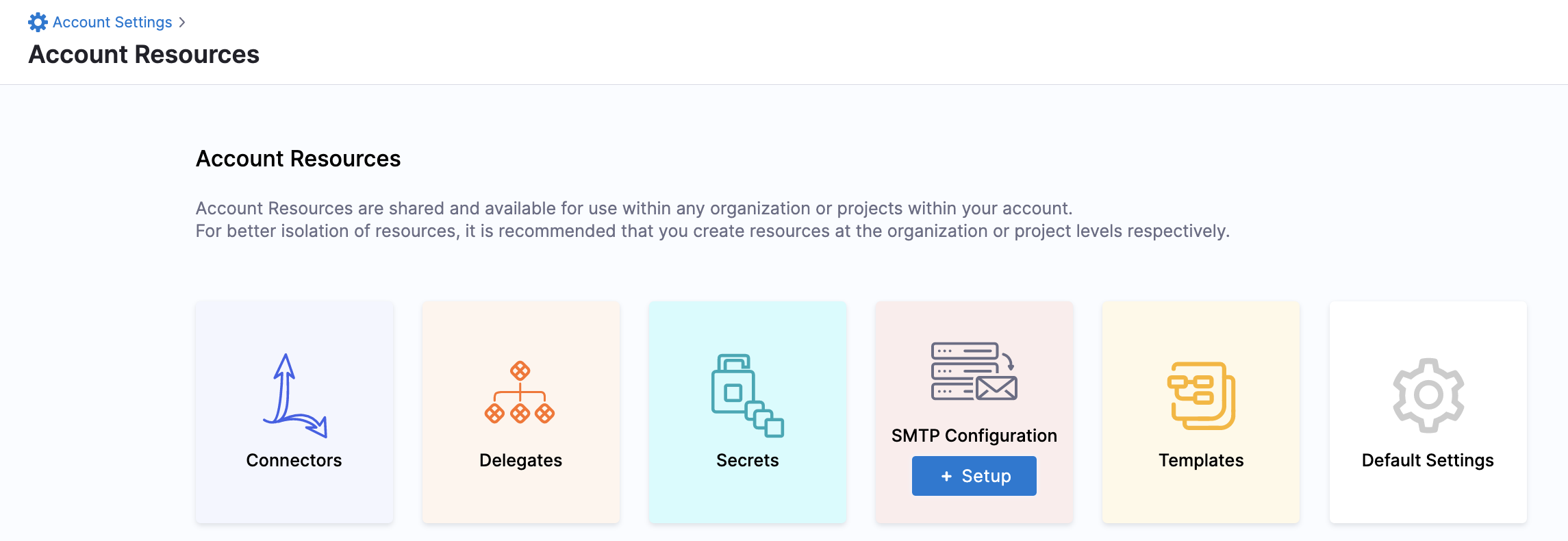 These are the Default Settings available for configuration at the Account scope. You can also configure Default Settings at the Org and Project scopes, but some options are not available at lower scopes.